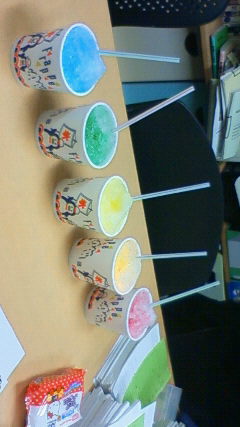 そして先生が帰ったあと、私、いつものOくん、彼女のMちゃん、お色気っつうか猥談担当Hちゃんと爽やか担当Sくんの5人に。ふと私が「かき氷って色違うけど味が一緒な気がする」と言ったせいで、味覚だけでどの味か分かるかを検証することに。いちご、メロン、レモン、ブルーハワイ、マンゴーの5種類を目をつぶって食べていき、それぞれ何味かあてていきました。結果からいうと、Oくんが全問正解でしたが、正直目をつぶると全然分からない(笑)他の4人は2つ以上の間違いでした。レモンは爽やかな感じなんで分かるんですが、特にブルーハワイとメロンの近似値高すぎ。ってかそもそもみんなガチすぎる(笑)この無駄なことにガチっていうとこが大学生らしいよね(笑)120×5個で1時間半も楽しんだ私たちは安上がりでした(笑)